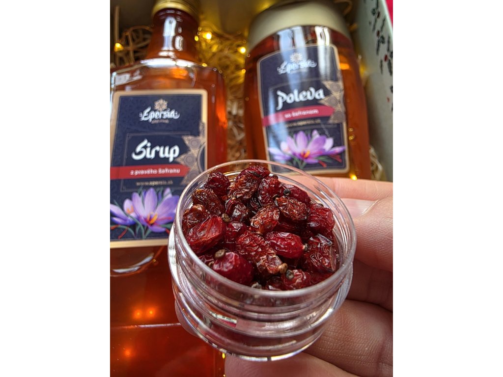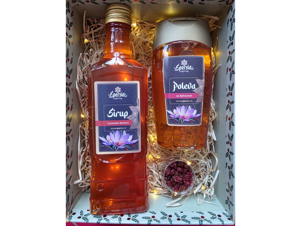 Obsahuje šafranovú polevu — hustú, jemne kyselkavú aromatickú polevu z pravého perzského šafranu ideálnu na dezerty, lievance — a šafranový sirup, osviežujúci a lahodný, vhodný do čaju, vody, prosecca či na dochutenie drinkov.